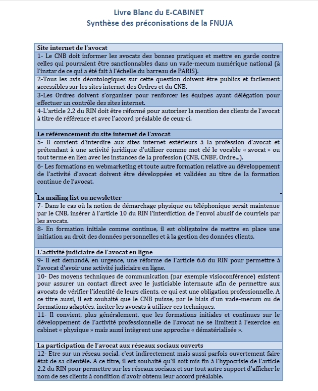 Synthèse des préconisations du livre blanc des Nouvelles Technologies Post published:21 octobre 2014 livre_blanc_du_e_cabinet_synthese_des_preconisation_de_la_fnuja.pdf Read more articles Article précédentLE LIVRE BLANC DU E-CABINET Article suivantLe GUIDE DE L’AVOCAT et du NUMERIQUE Vous devriez également aimer LE LIVRE BLANC DU E-CABINET 23 septembre 2014 Les Ateliers du Numérique de la FNUJA : premier arrêt à Aix-en-Provence ! 28 février 2023